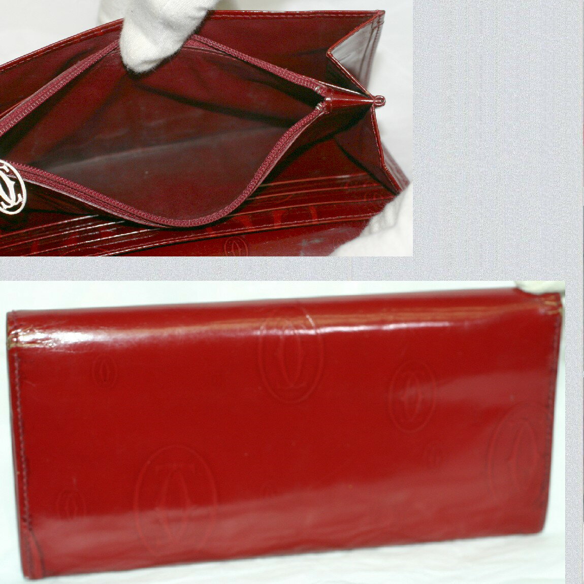 カルティエの女性用のボルドー色ガラスカーフ素材の表面にカルティエマークが刻印されているハッピーバースデーの長財布の出品です。